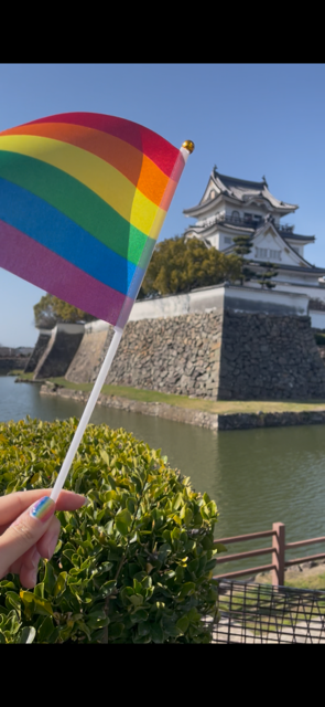 レインボーフラッグを持って、「LGBTQに理解を!ハッピープライド!」と声を出しながら、岸和田駅周辺や市役所、岸和田城の周りをパレードしてきました。